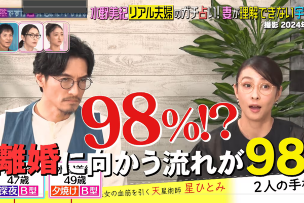 水野の手相を見た占い師から、4年前の鑑定ではなかったはずの“別居線”と“離婚線”が出ており、離婚に向かう流れが98パーセントの割合を占めていると説明が。あまりの衝撃的な内容に、水野は『えぇー!98%?』と驚きの声をあげた。